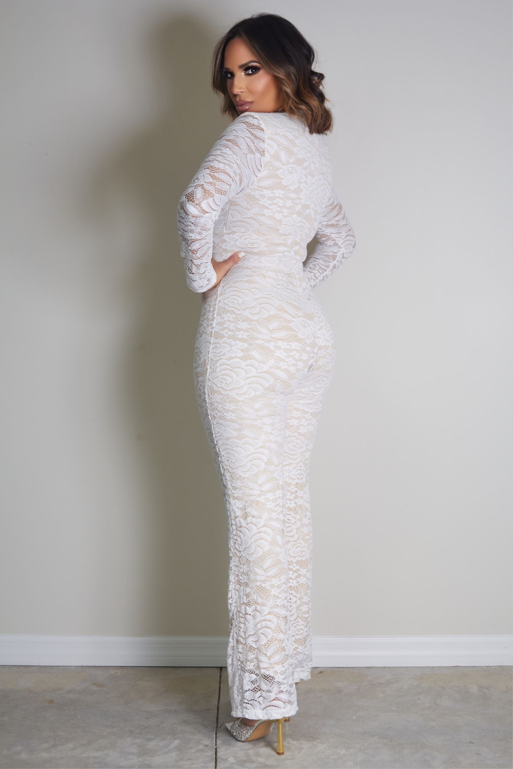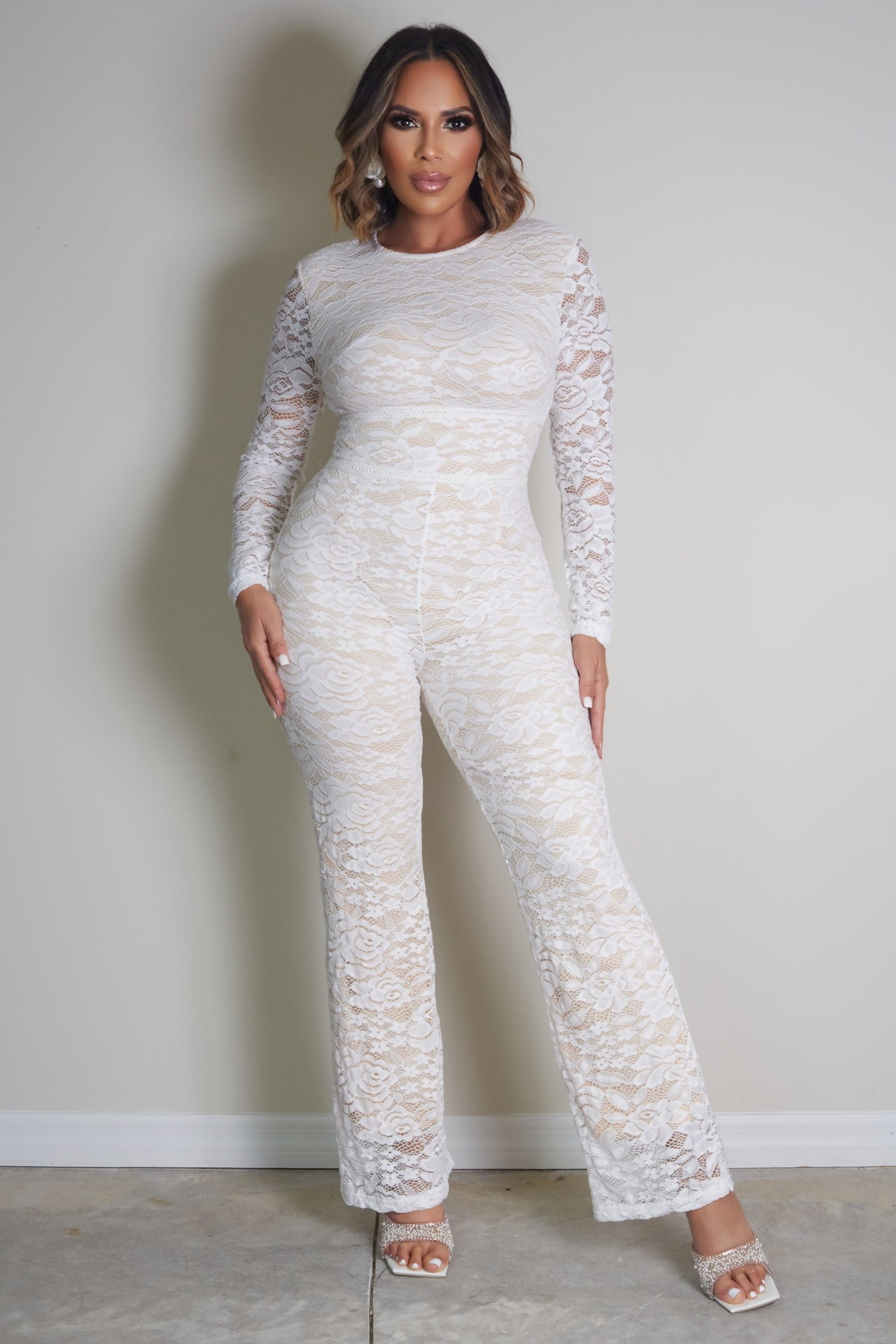Exude sophistication with the Florencia Elegant Long Sleeves Lace Jumpsuit. Featuring a timeless round neckline and cinched high waist, this semi-sheer lace jumpsuit offers a flattering silhouette. Designed with long sleeves and a convenient zipper closure, its medium-stretch fabric ensures both comfort and elegance. Perfect for parties or social gatherings, this jumpsuit is a stunning choice for any chic occasion.