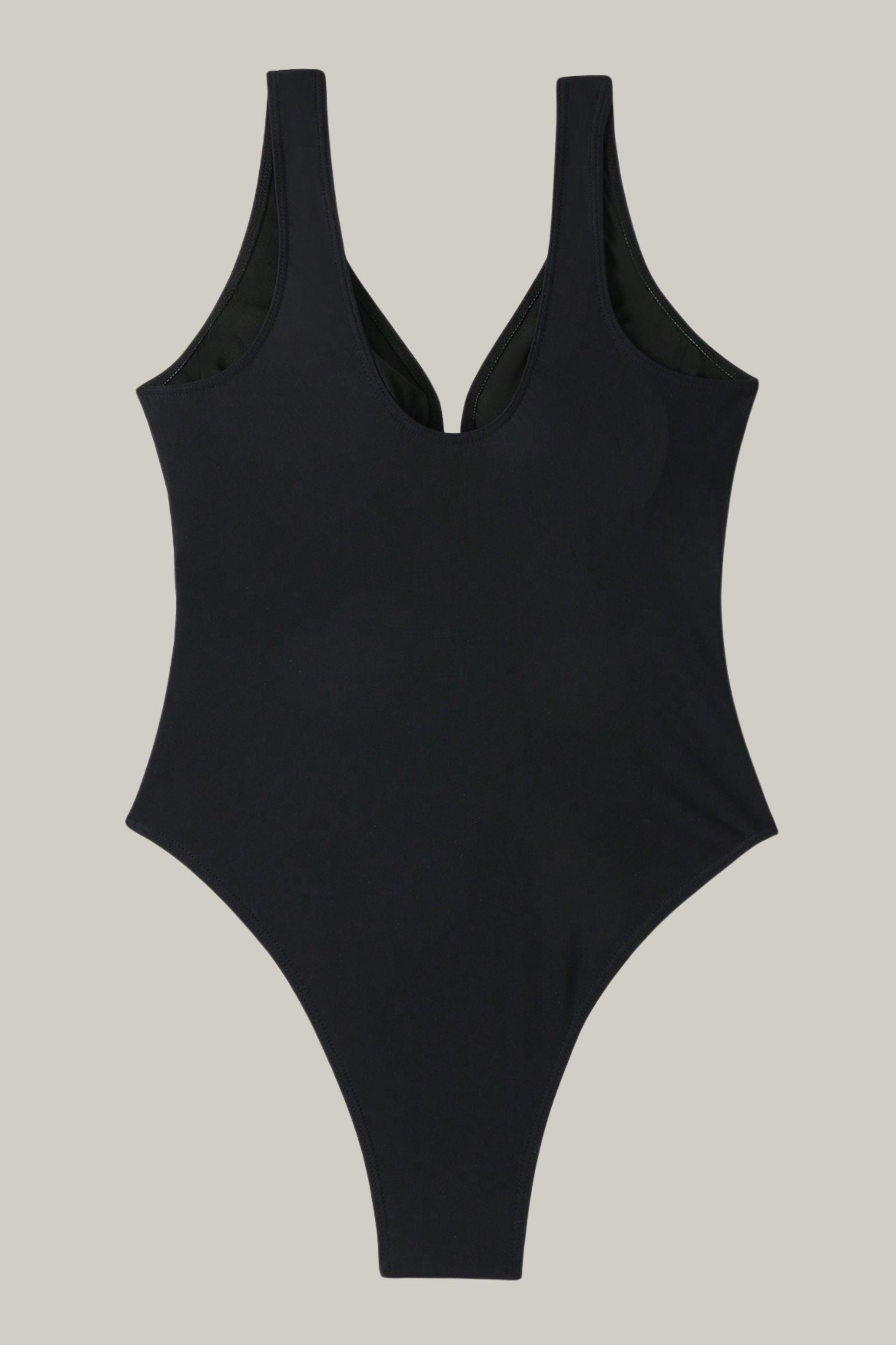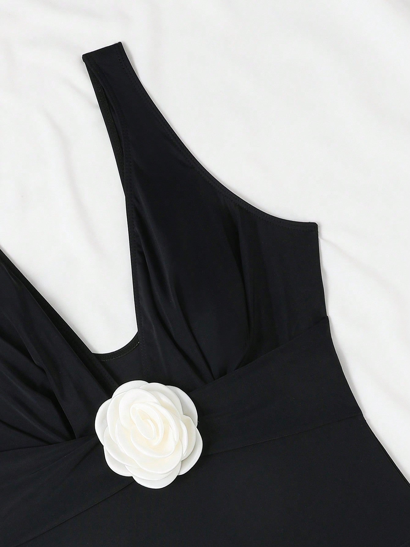 Elevate your beach style with our Floral Decor Deep V-Neck One-Piece Swimsuit in elegant black. This sophisticated swimsuit features a beautiful flower applique and a daring backless design. The plunge neckline and wireless bra offer a flattering fit, while the high-stretch, lined fabric ensures comfort and support. With removable padding for customizable coverage, this sleeveless swimsuit is perfect for making a chic statement at the beach or pool.