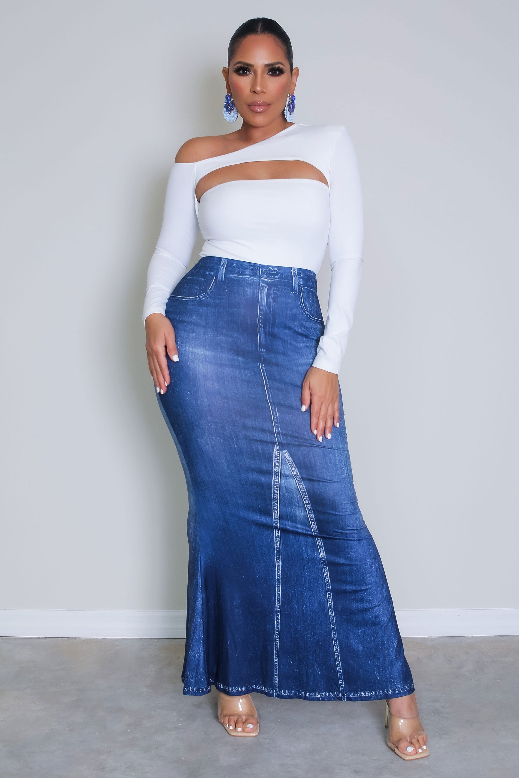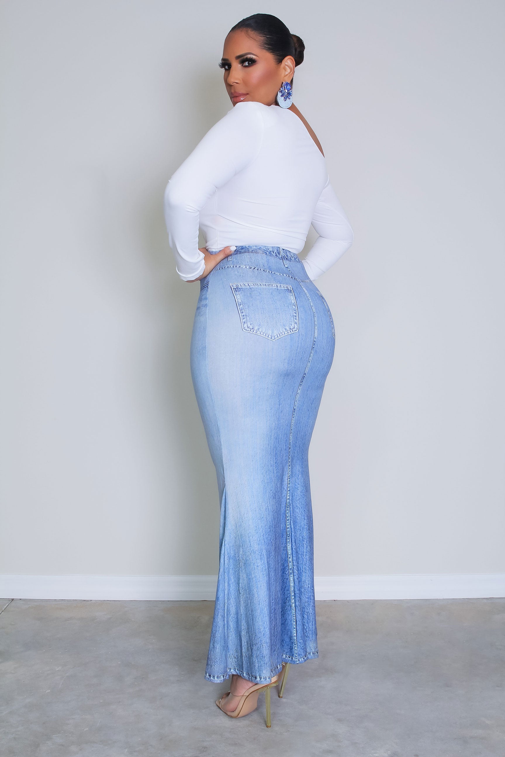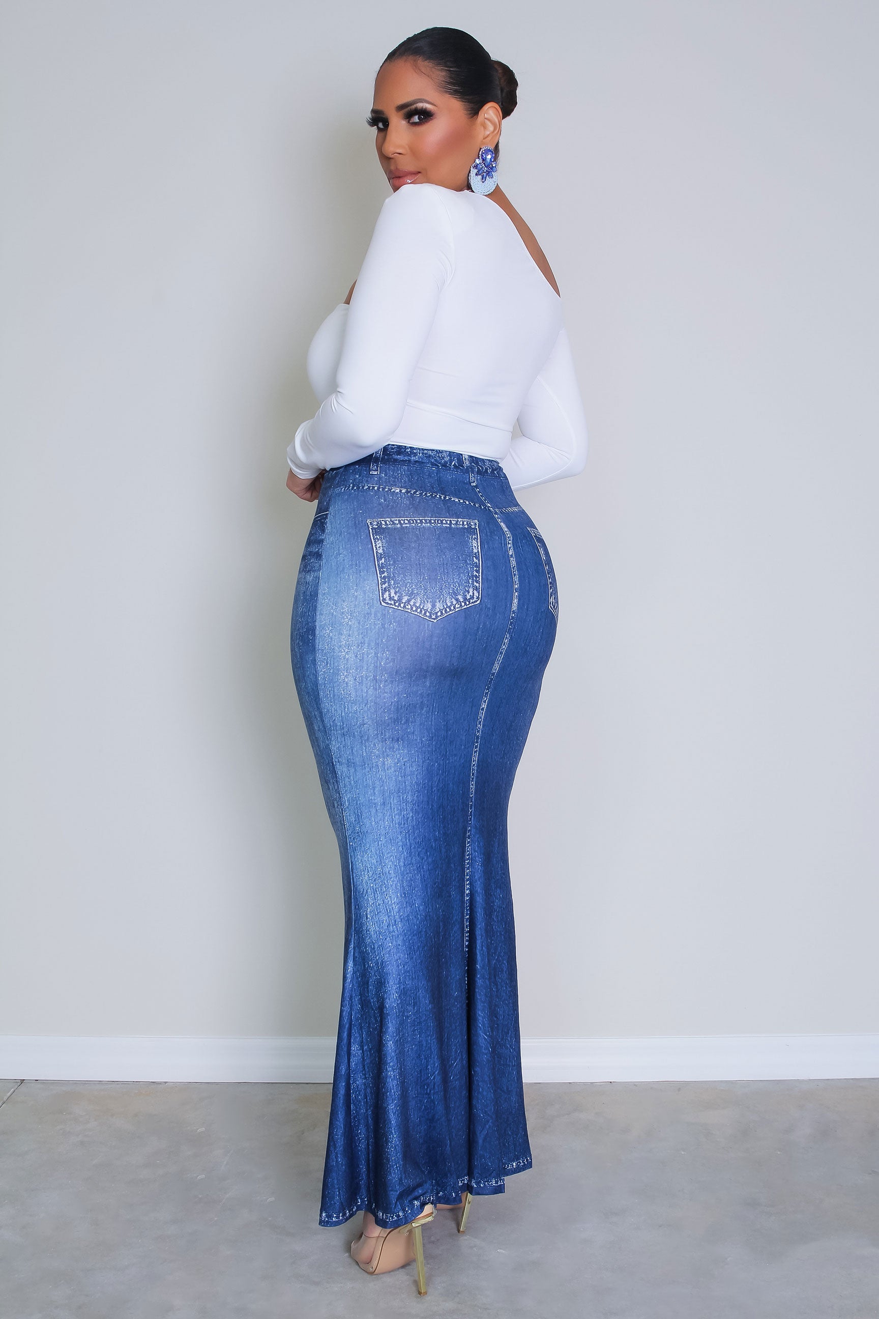 Elevate your casual look with our Melanie Denim-Effect Print Mermaid Hem Skirt. This maxi skirt features a plain pattern with a denim-like print, adding a touch of casual sophistication to your outfit. Crafted from knitted fabric, it offers both comfort and style. With a high waistline and mermaid hem, it accentuates your figure while maintaining a trendy silhouette. The skinny fit design adds a modern twist, making it perfect for everyday wear. Pair it with your favorite top for a chic and effortless ensemble.