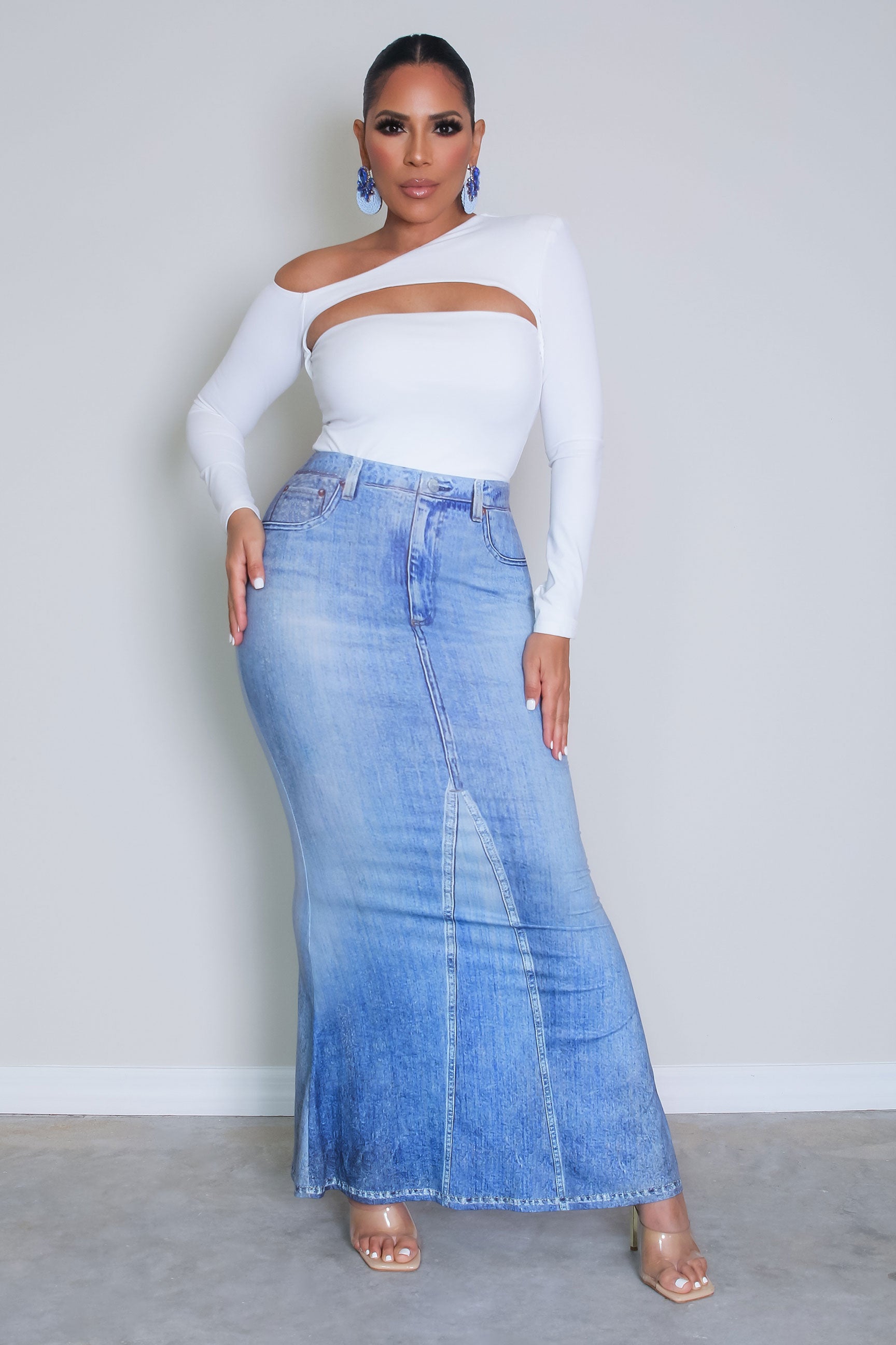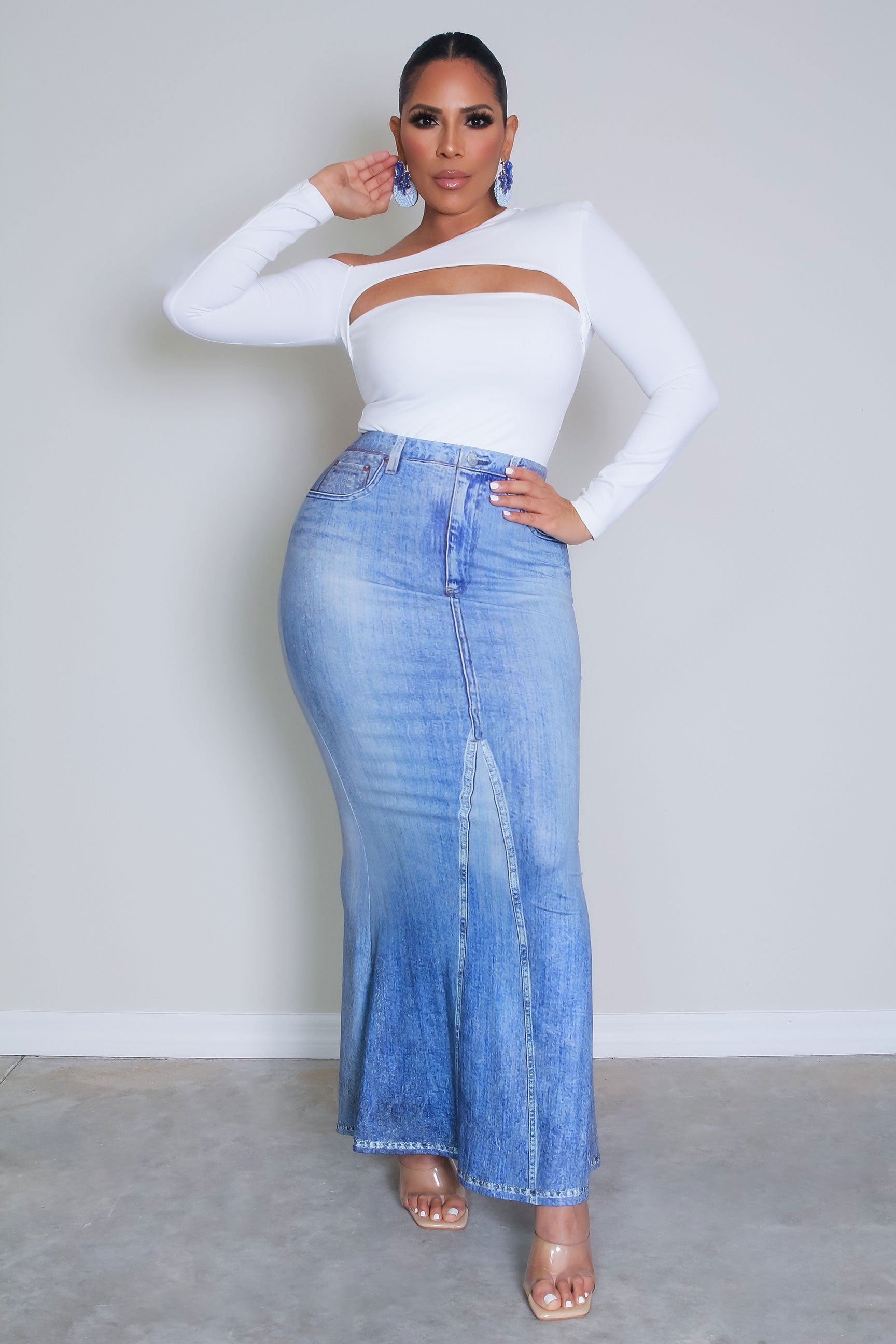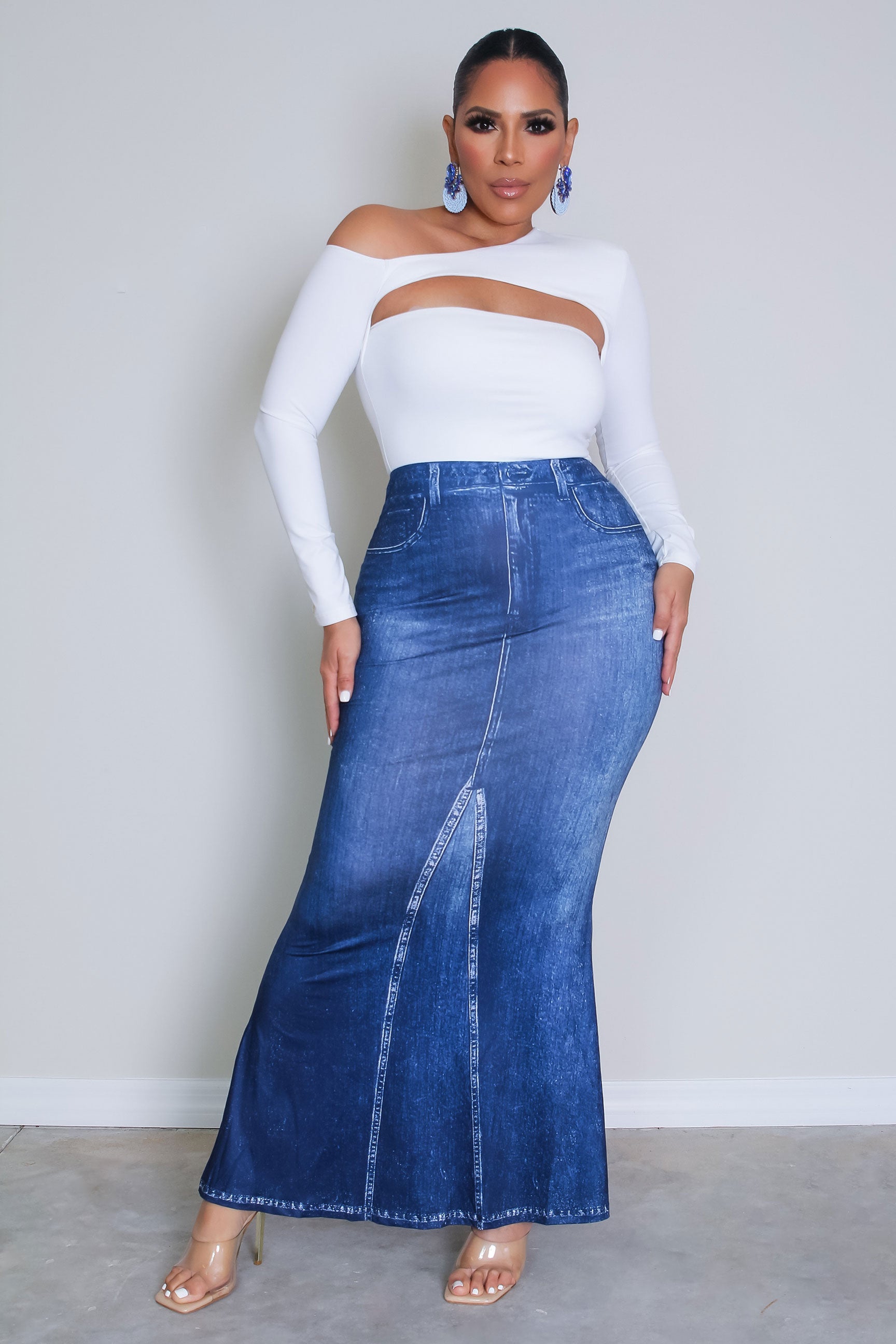 Elevate your casual look with our Melanie Denim-Effect Print Mermaid Hem Skirt. This maxi skirt features a plain pattern with a denim-like print, adding a touch of casual sophistication to your outfit. Crafted from knitted fabric, it offers both comfort and style. With a high waistline and mermaid hem, it accentuates your figure while maintaining a trendy silhouette. The skinny fit design adds a modern twist, making it perfect for everyday wear. Pair it with your favorite top for a chic and effortless ensemble.
