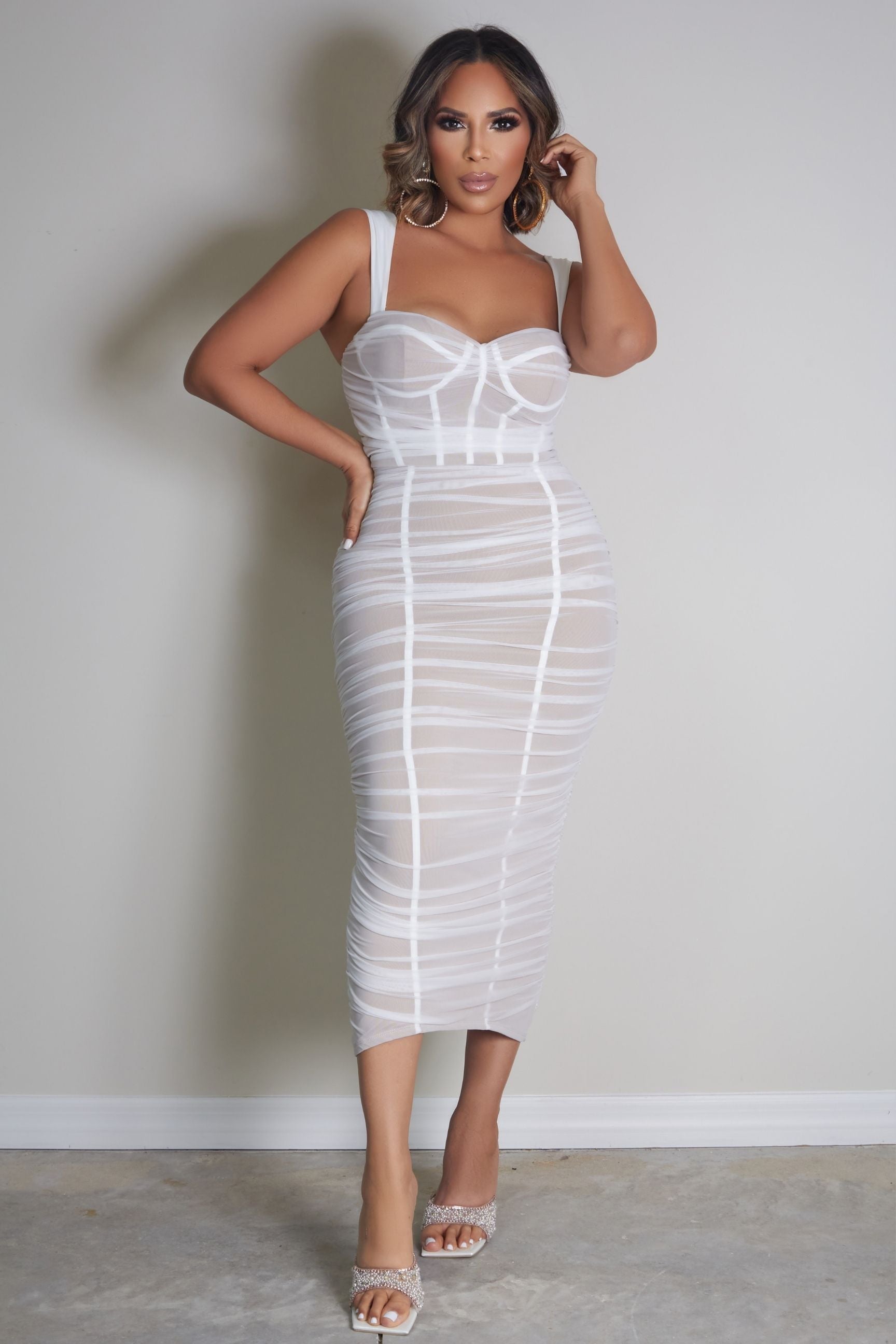 The Christina Corset Ruched Mesh Midi Dress is the perfect statement for any Holiday, prom, date night, cocktail party, Mother's Day or any casual elegance. This slim-fit white cami dress features delicate ruched detailing and a flattering pencil-shaped hem. With its corset-style bodice, sleeveless straps, and high-stretch knitted fabric, this elegant, sexy dress offers a comfortable yet chic silhouette. Ideal for any season and occasion, it’s both sophisticated and effortlessly stylish.