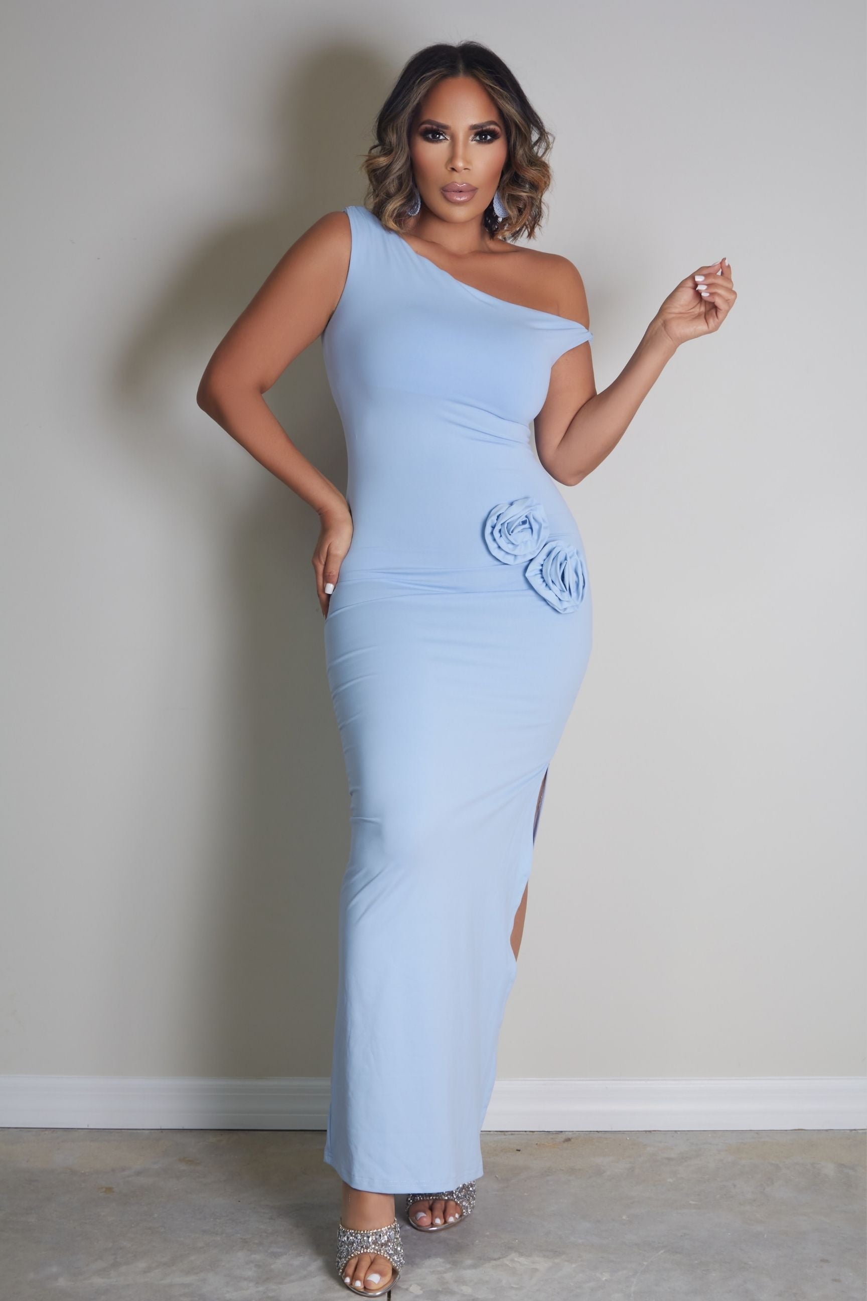 The Phoebe Oblique Shoulder 3D Floral Dress is the epitome of elegance for summer, holidays and romantic dates. This stunning maxi dress features a unique asymmetrical neckline and a sexy high slit that highlights your silhouette beautifully. Crafted from high-stretch knitted fabric, it offers a fitted design with a natural waistline for a flattering look. The exquisite 3D floral appliques add a touch of sophistication, while the lined body ensures comfort. Perfect for making a memorable impression at any special occasion.