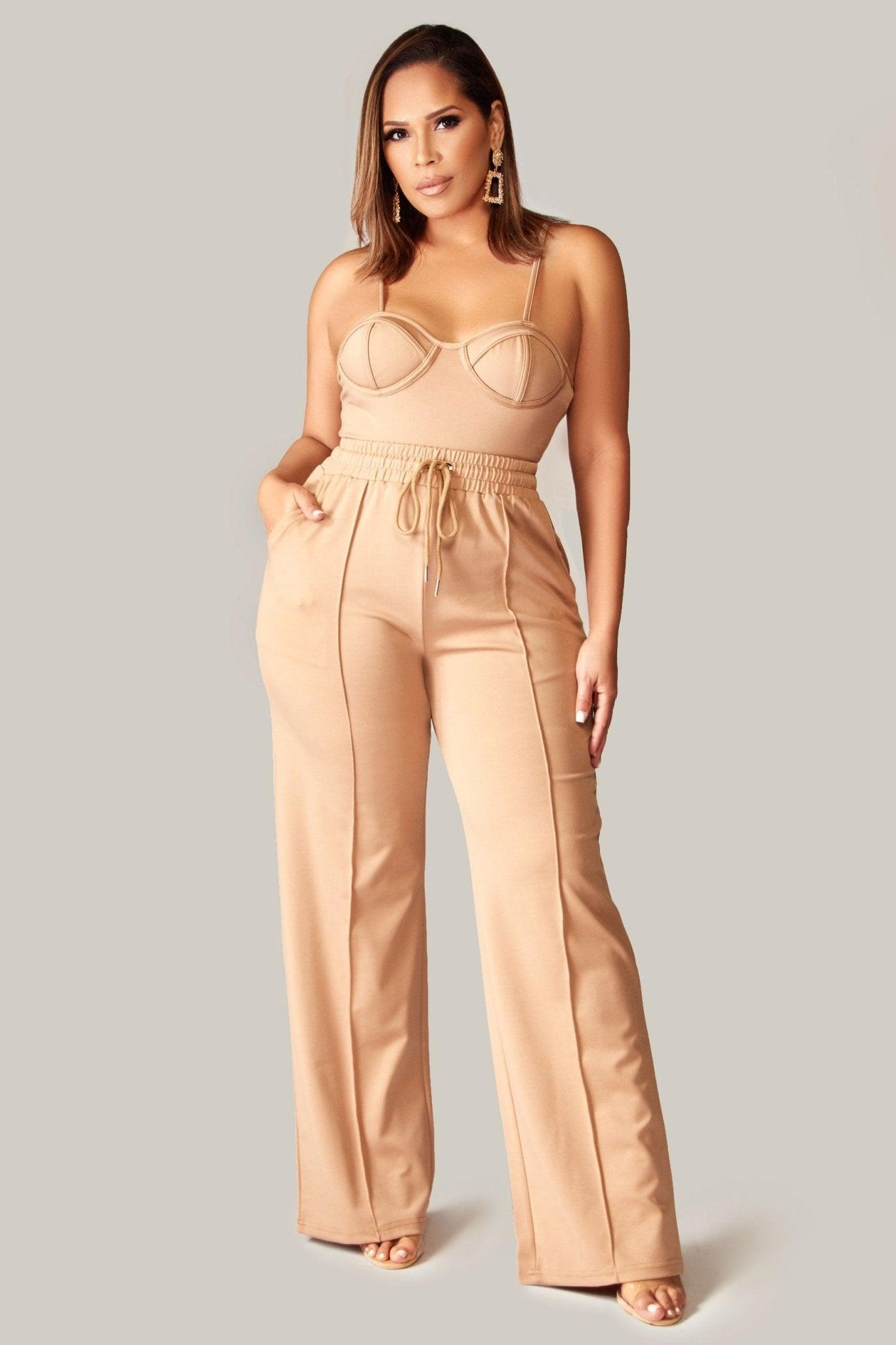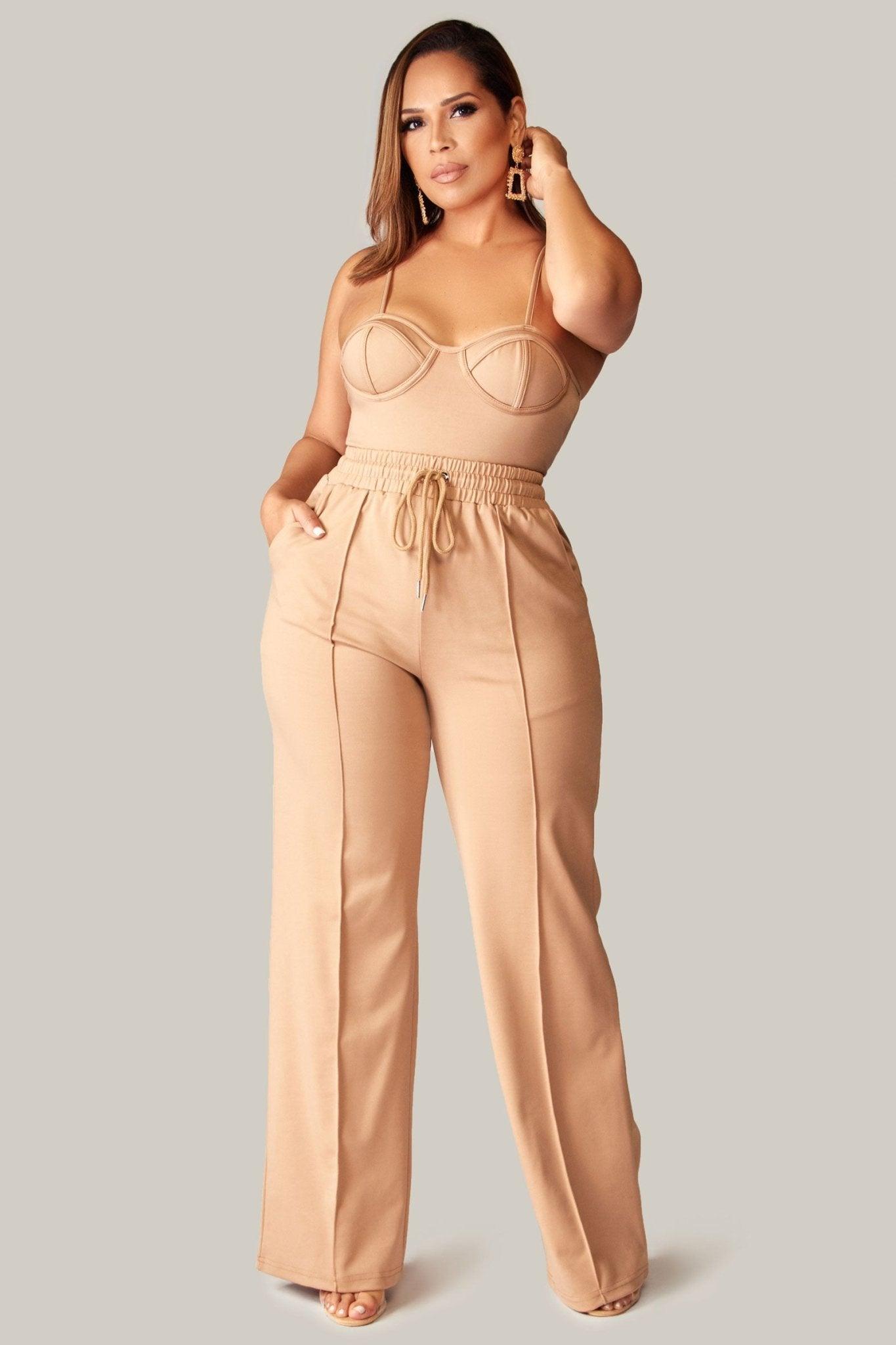 - 2 Piece set includes: Pants and spaghetti strap corset bodysuit top.