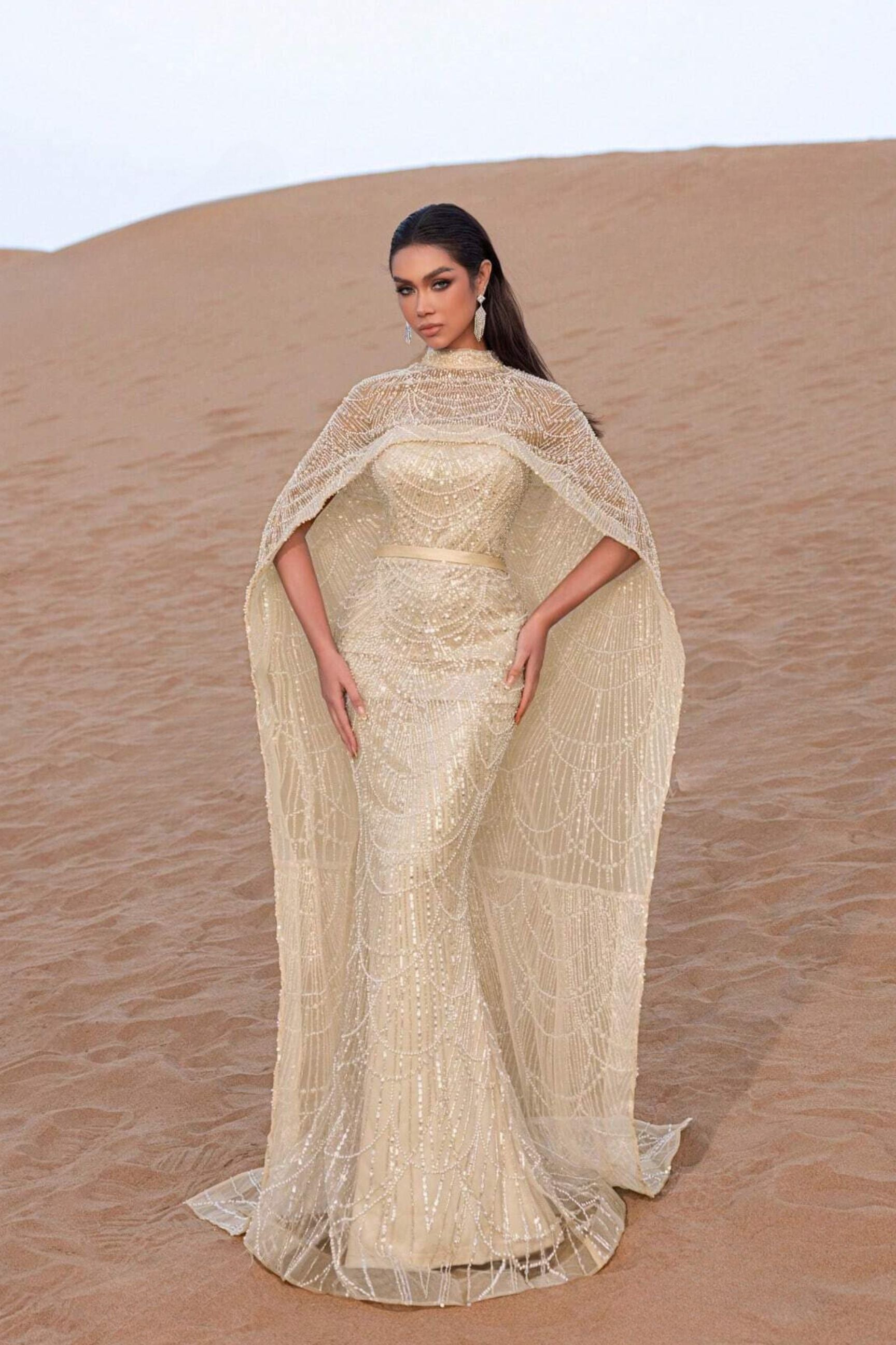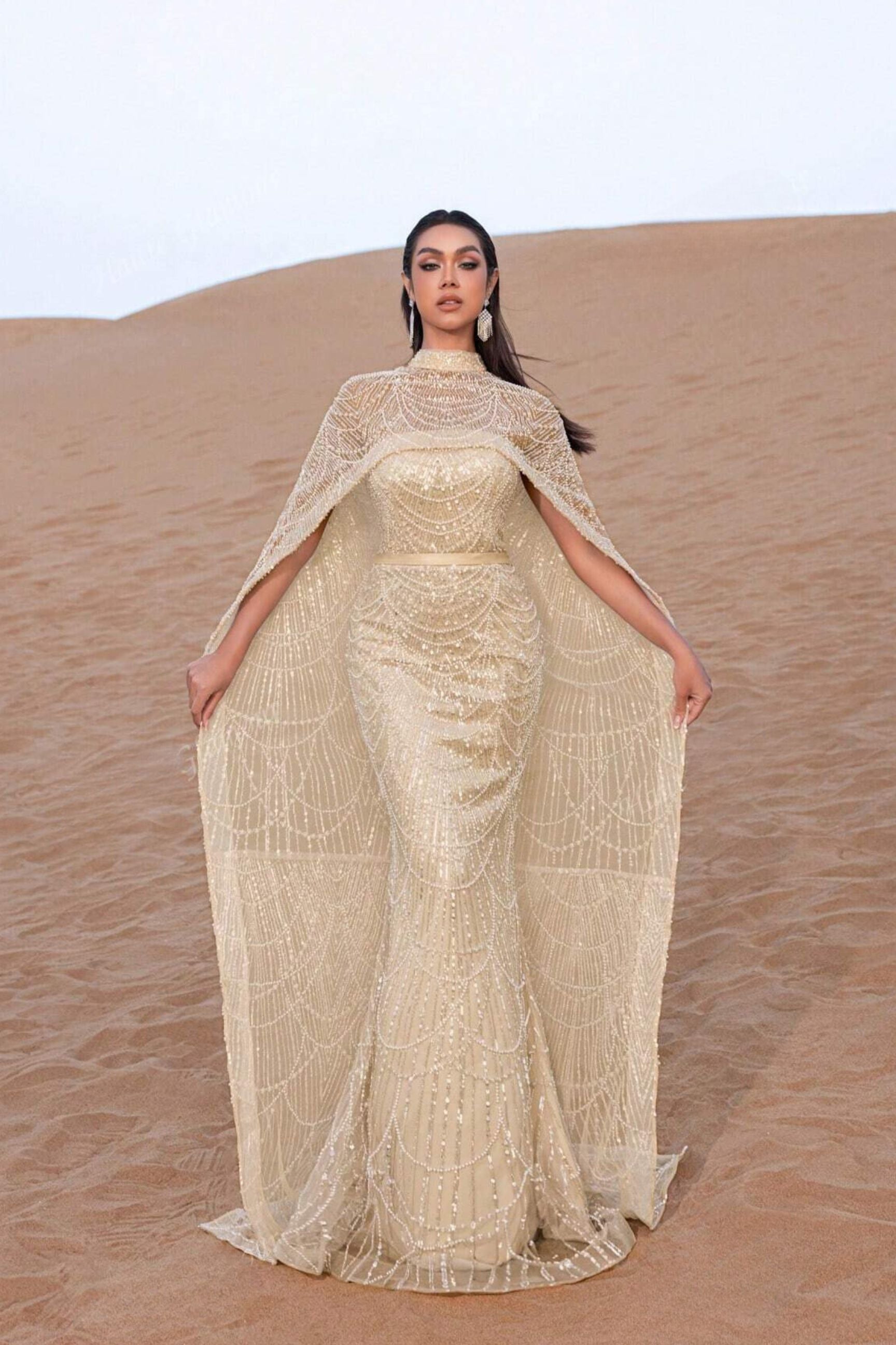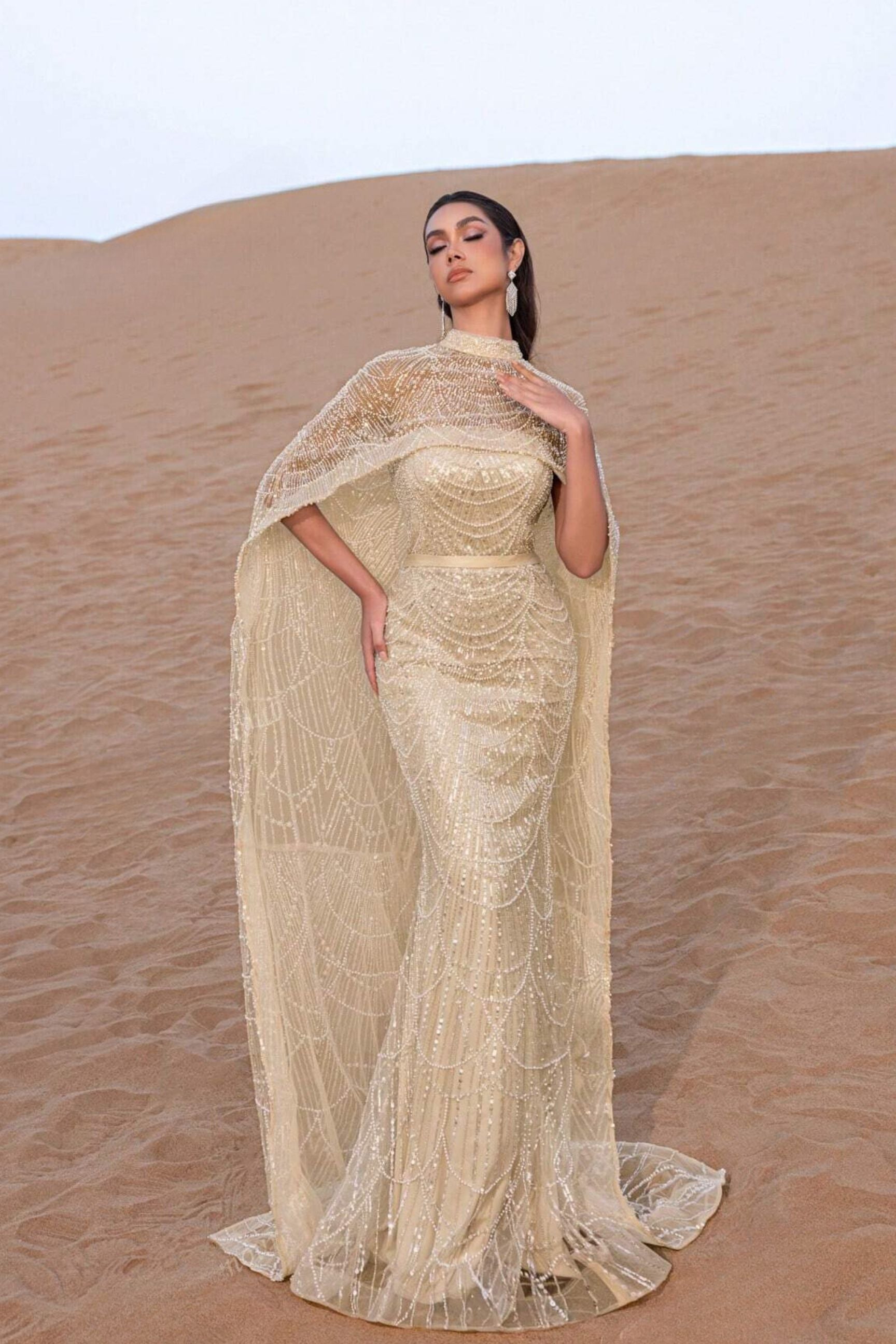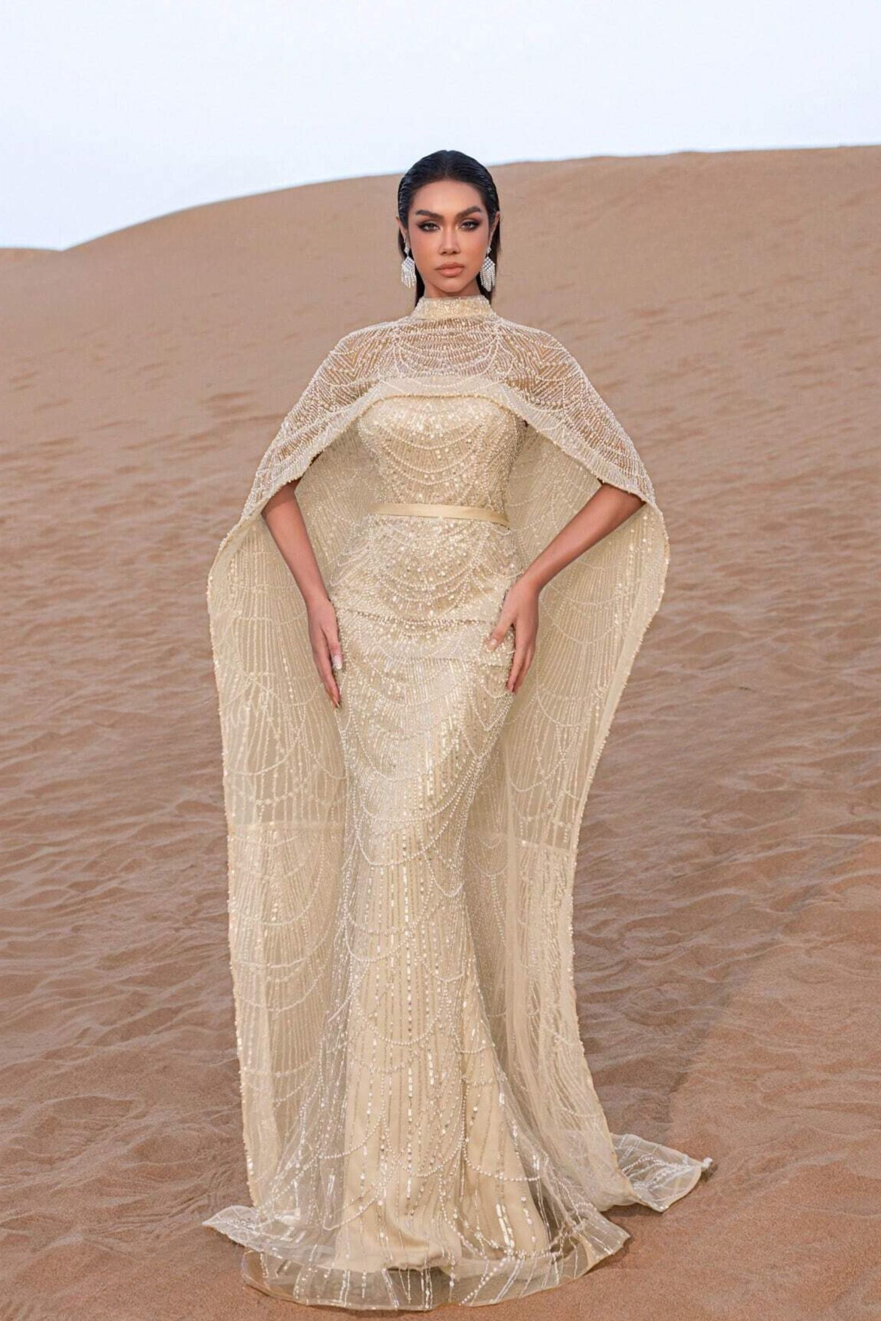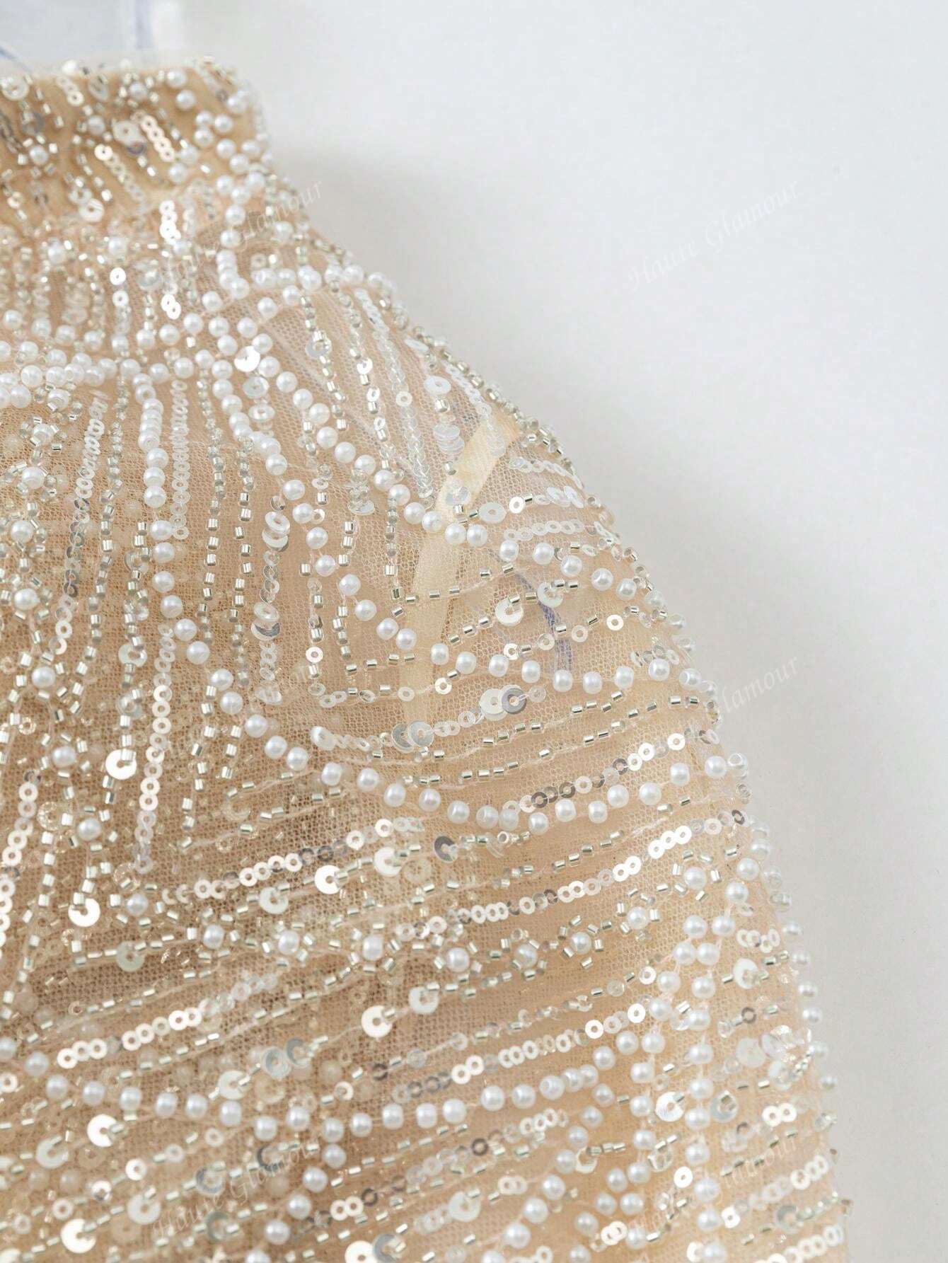 Step into a world of opulence with the Luxury Mock Neck Cape Sleeves Beaded Formal Dress. This breathtaking evening gown exudes sophistication and grace, featuring a high mock neckline and dramatic cloak sleeves that flow with every movement. Adorned with intricate beading, this dress sparkles with elegance, making it the perfect choice for high-end events such as weddings, galas, and elegant soirées. The high waistline creates a flattering silhouette, while the slight stretch fabric ensures a comfortable fit. Lined for added luxury, this show-stopping dress is an unforgettable choice for your next formal or evening occasion.