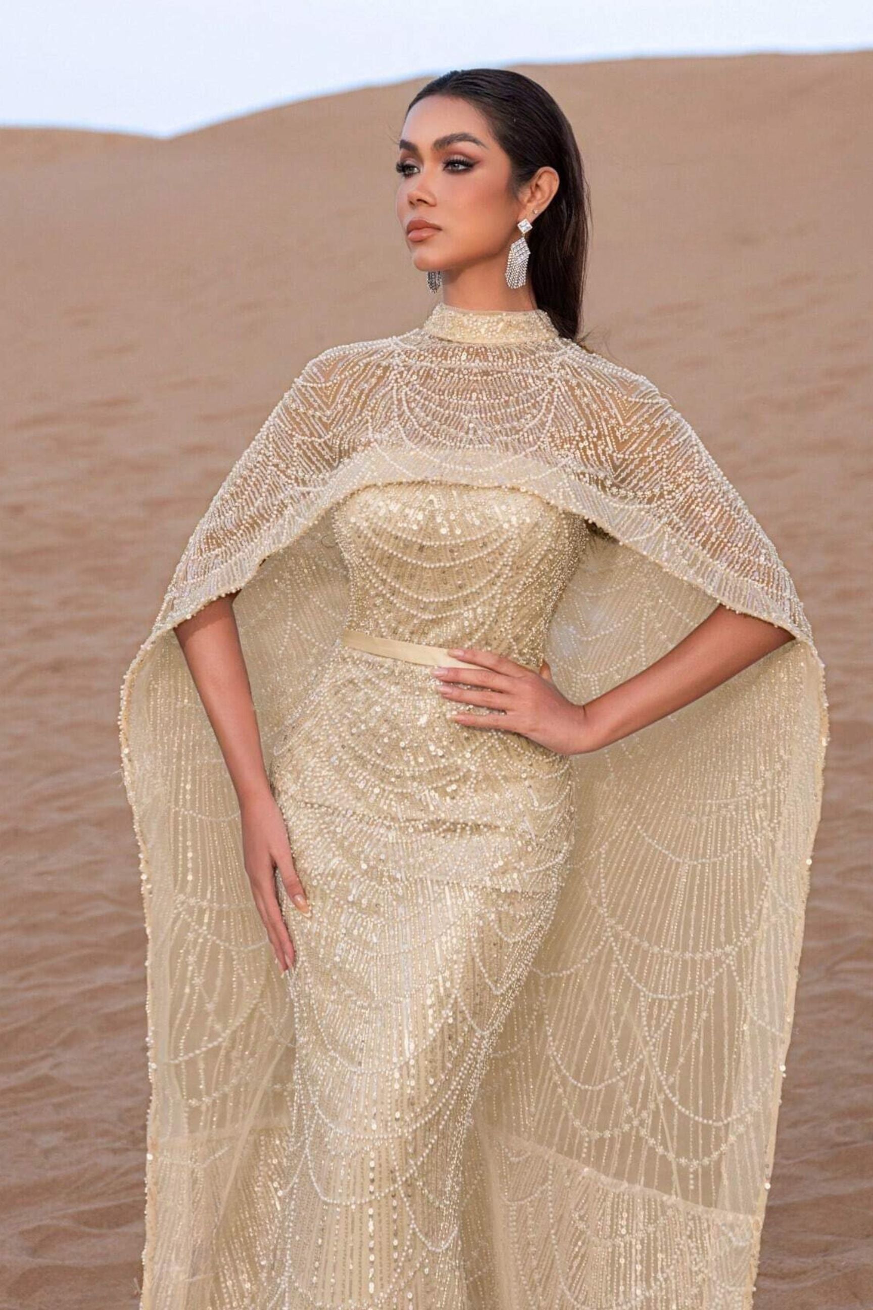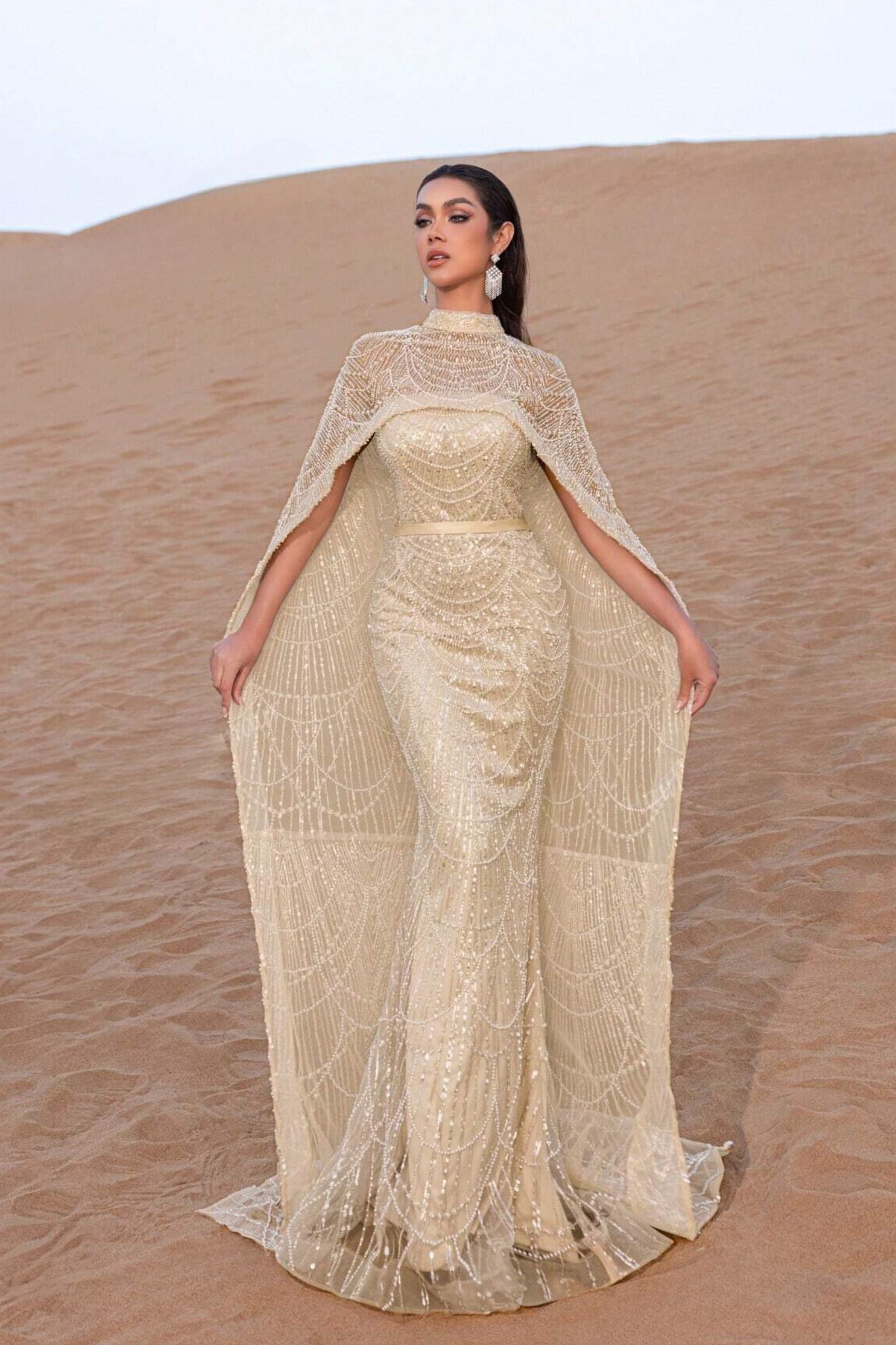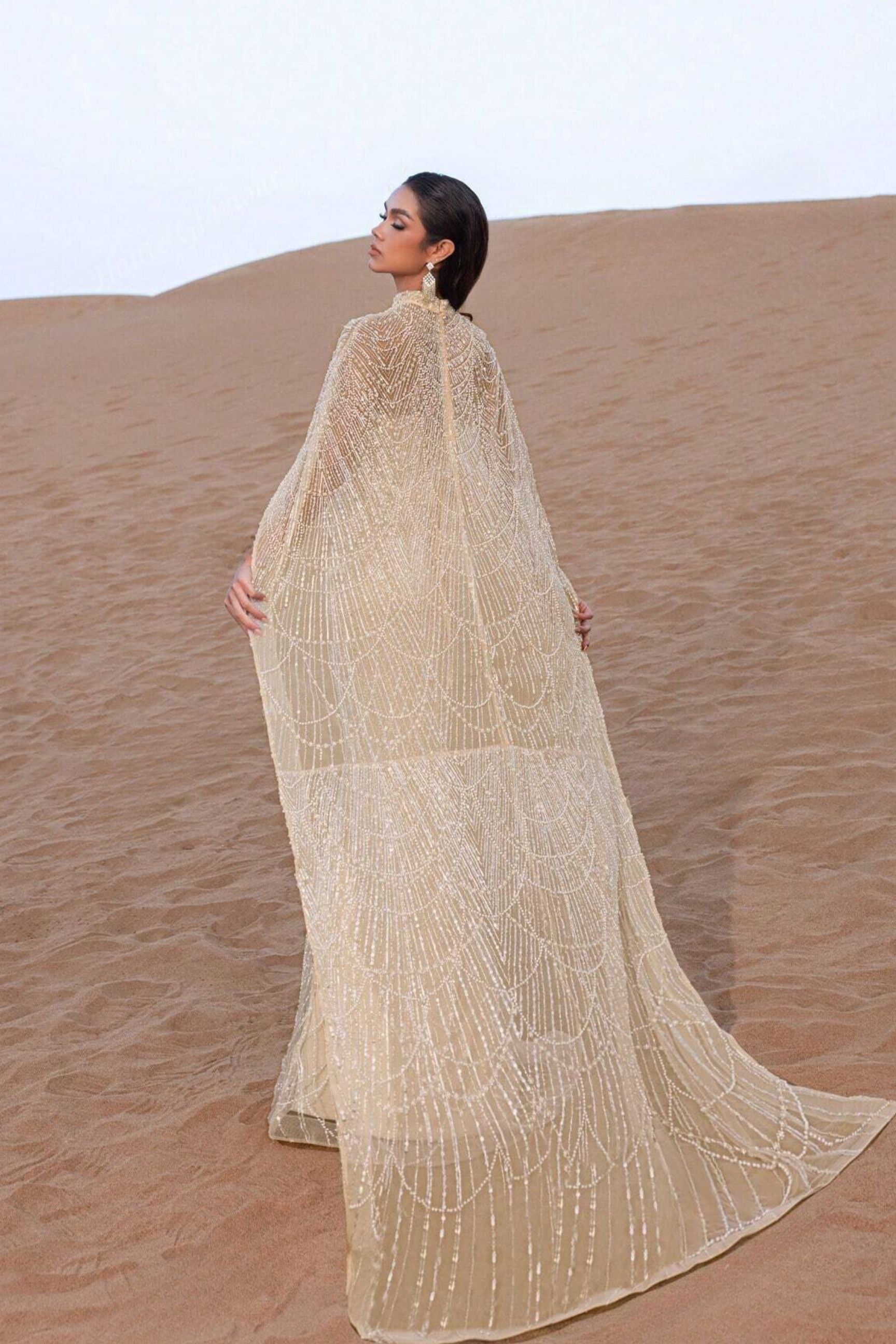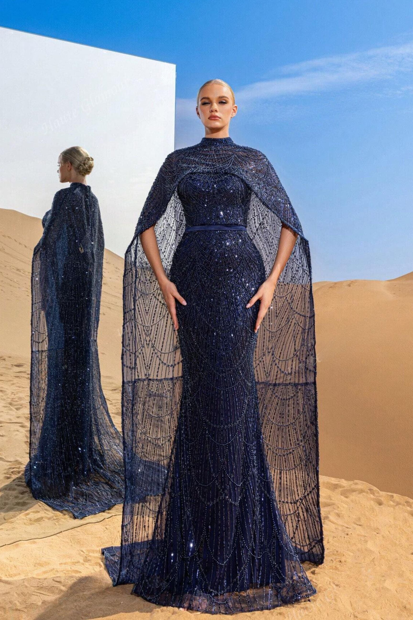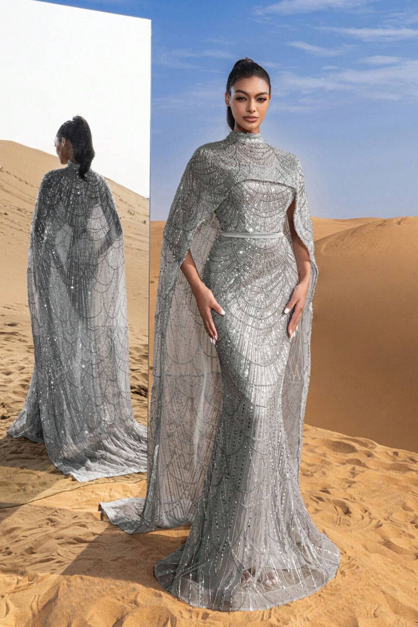 Luxury Mock Neck Cape Sleeves Beaded Formal Dress