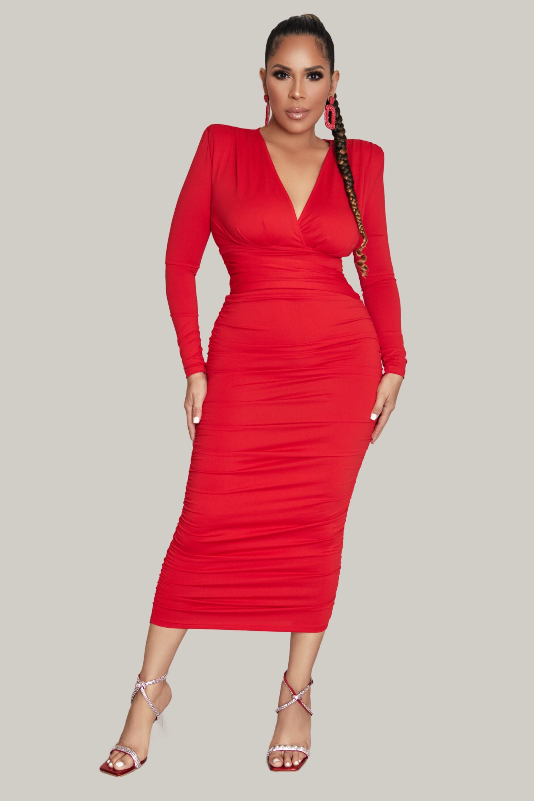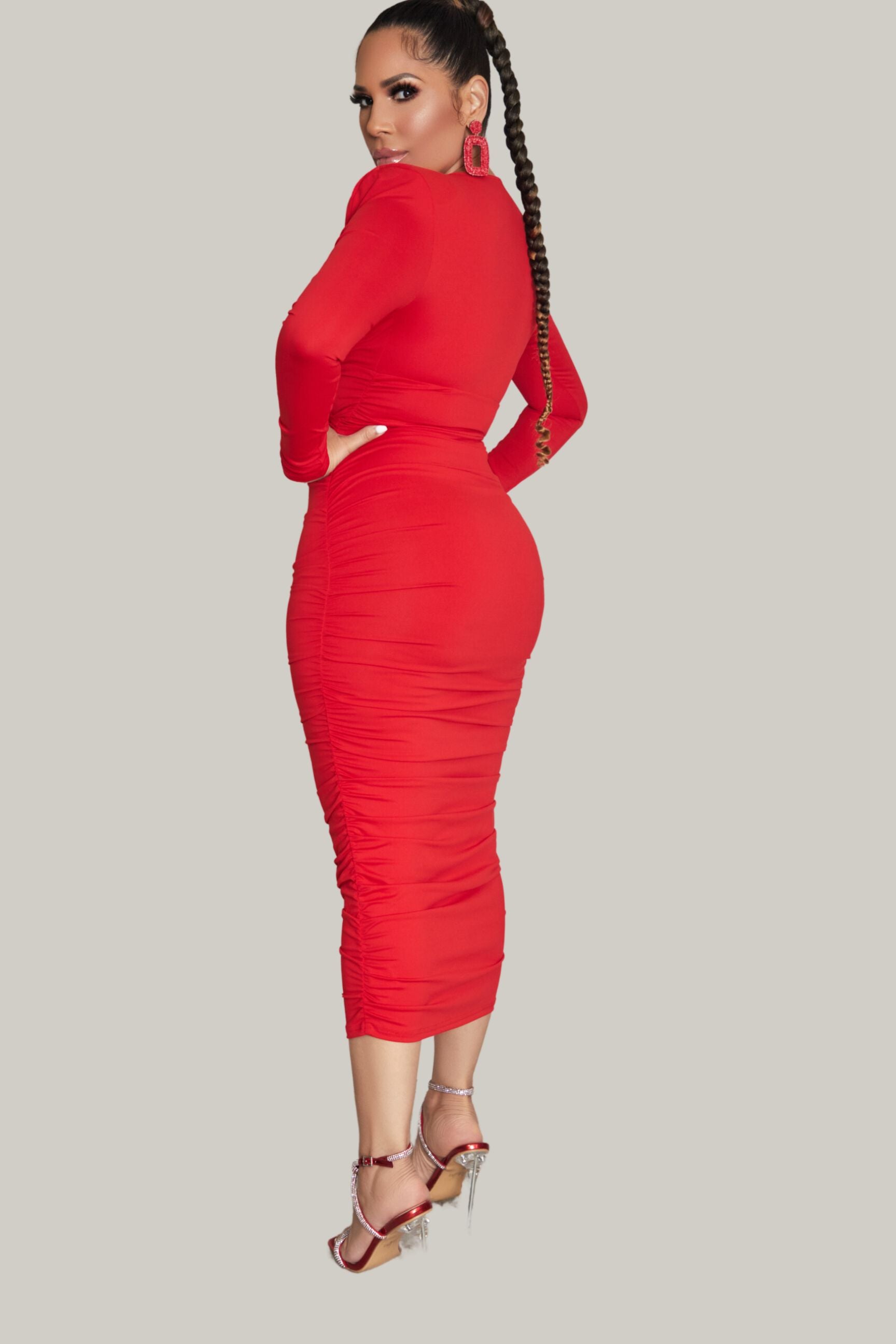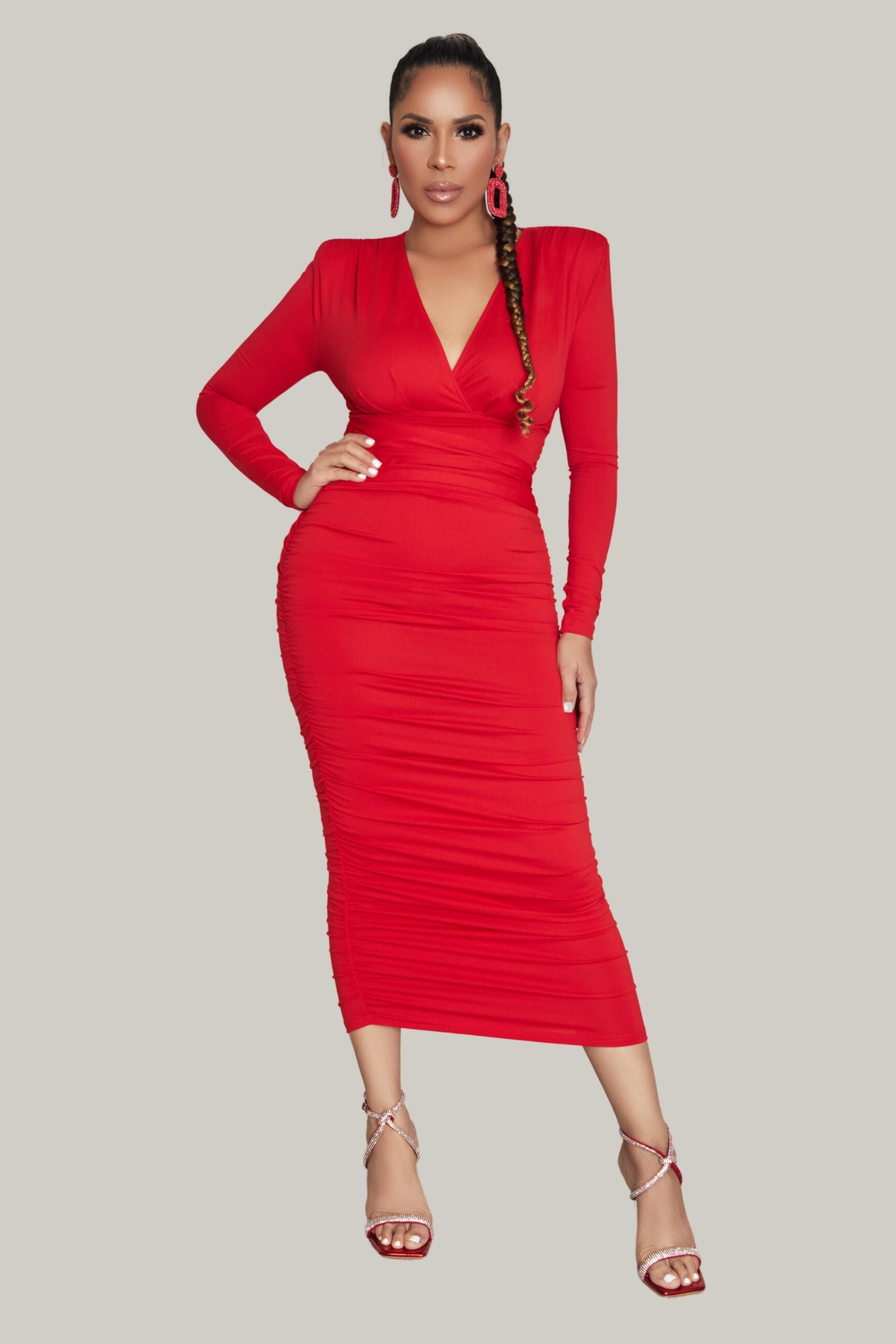 Crafted with a deep V neckline and long sleeves, this dress exudes sophistication while accentuating your curves. The ruched detailing along the bodice not only adds texture but also creates a flattering body slimming effect.
