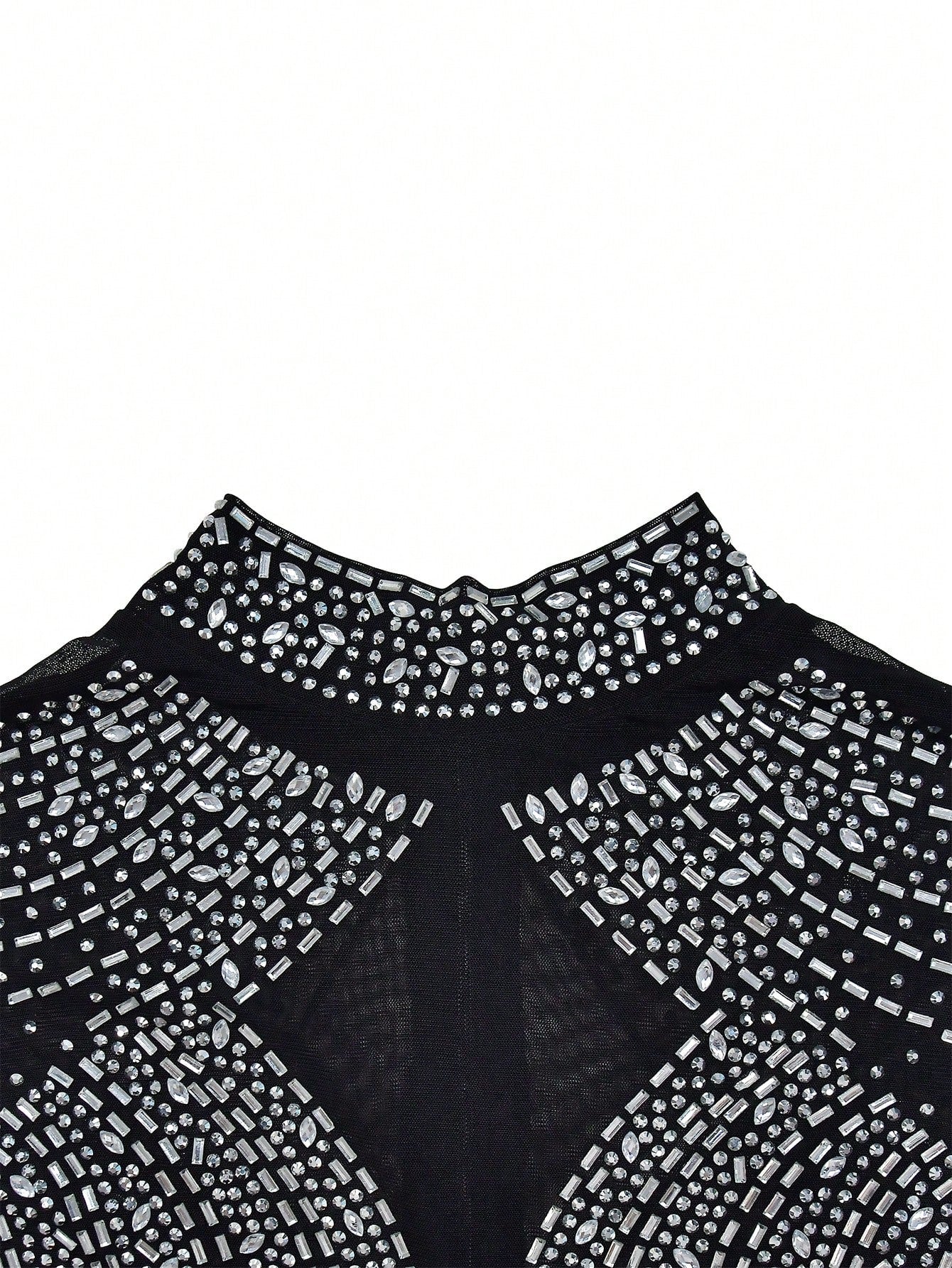 Experience exquisite luxury with the Mara Studded Mesh Sleeveless Jumpsuit. Featuring contrasting mesh and dazzling rhinestone details, the sheer sleeves add a touch of sophistication. This long, sleeveless jumpsuit boasts a regular fit and high waistline, made from a slight stretch polyester material. Be enchantingly elegant in this semi-sheer masterpiece.